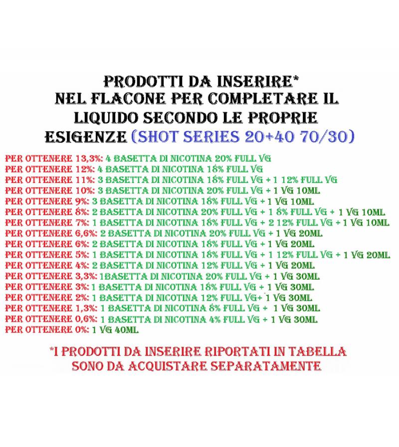 TNT VAPE SHOT MIX 20 MLGUSTO : MIX DI TABACCHI.(DA AGGIUNGERE 40ML NON COMPRESI NEL PREZZO)PER OTTENERE UNA CORRETTA COMPOSIZIONE IN BASE ALL'ESIGENZA, SEGUIRE LE INDICAZIONI RIPORTATE IN TABELLA.OPPURE NELLA BARRA DI RICERCA SCRIVI 'PACK SHOT 20+40' E TROVERAI DIRETTAMENTE LA COMPOSIZIONE DA ACQUISTARE.